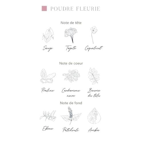Invitez la tendresse dans votre salon ou chambre avec "Poudre Fleurie". Imaginez un voile délicat de coquelicots et de violettes poudrant l'air, créant un havre de paix. Ce parfum musqué, évoquant la fraîcheur et la propreté, vous enveloppe d'une sensation de sécurité et de confort. À mesure qu'il se diffuse, une note de vanille, à la fois douce et sensuelle, vient enrichir l'atmosphère. "Poudre Fleurie" est une caresse pour l'âme, apportant à votre espace une chaleur poudrée et une sérénité enveloppante.