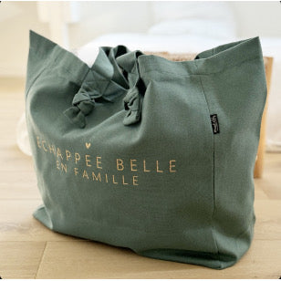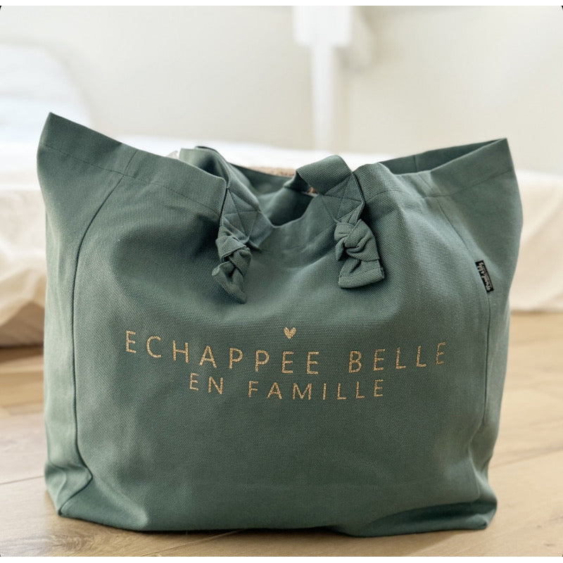 Couleur eucalyptus avec imprimé "Echappée Belle en famille " pailleté or. Parfait pour partir à l'aventure en famille...