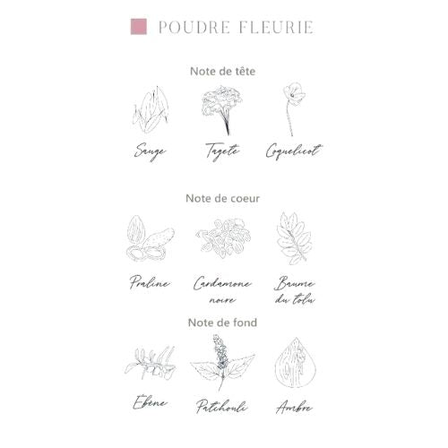 Invitez la tendresse dans votre salon ou chambre avec "Poudre Fleurie". Imaginez un voile délicat de coquelicots et de violettes poudrant l'air, créant un havre de paix. Ce parfum musqué, évoquant la fraîcheur et la propreté, vous enveloppe d'une sensation de sécurité et de confort. À mesure qu'il se diffuse, une note de vanille, à la fois douce et sensuelle, vient enrichir l'atmosphère. "Poudre Fleurie" est une caresse pour l'âme, apportant à votre espace une chaleur poudrée et une sérénité enveloppante.