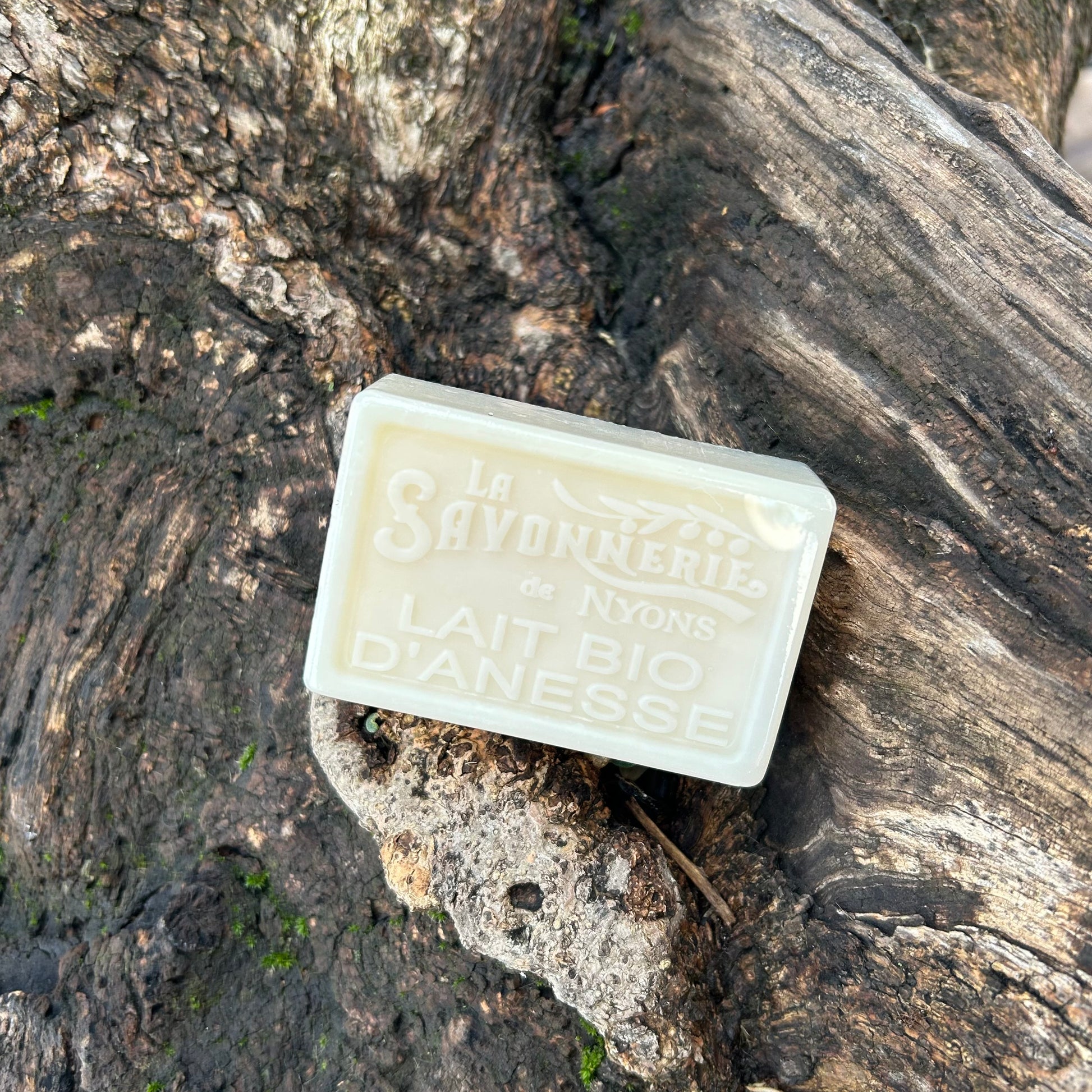 Ce savon au lait d'ânesse bio rectangle de 100g est enrichi en beurre de karité BIO et en huile d'olive de Nyons aux propriétés adoucissantes et protectrices.