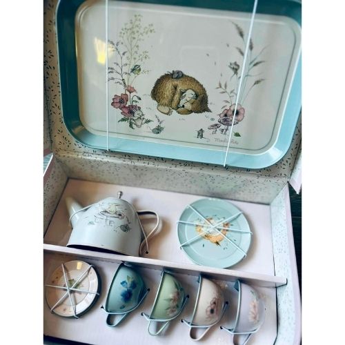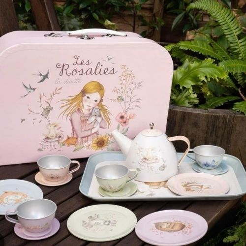Ravissante valise service à thé en métal illustré de fleurs et d’animaux favoris de nos amies "les Rosalies".